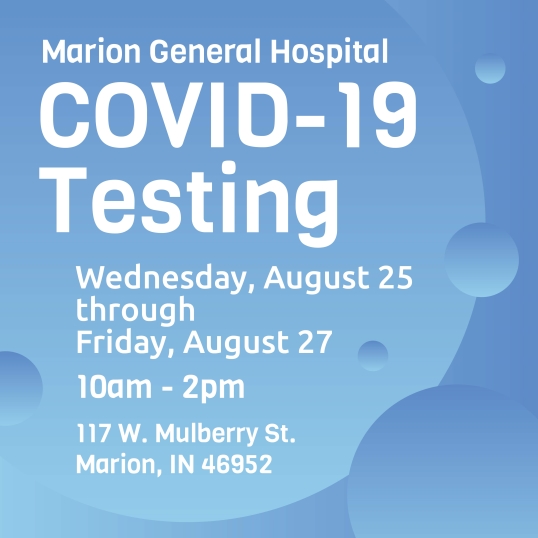 Marion Health will host a COVID-19 drive-thru testing site from Wednesday, August 25 to Friday, August 27, from 10am-2pm each day. The testing site will be in the parking lot of 117 W. Mulberry St., Marion, IN 46952. No appointment is necessary, and those coming for testing should bring their insurance card. The drive-thru site is for individuals who are asymptomatic but have been exposed, or for those whose symptoms are mild. Any individuals in need of medical attention should contact a primary care physician, Marion Health Express or the MGH Emergency Room, depending on the severity of the symptoms.